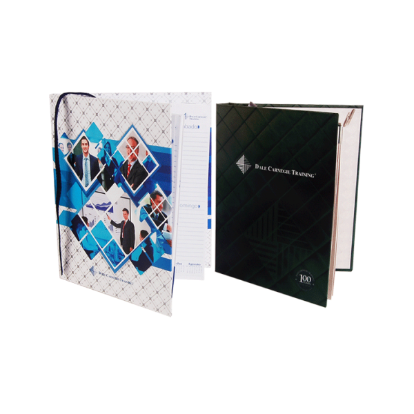 ACABAMENTOS: Esquerda – laminação fosca, verniz UV localizado, verniz textura, elástico e wire-O.